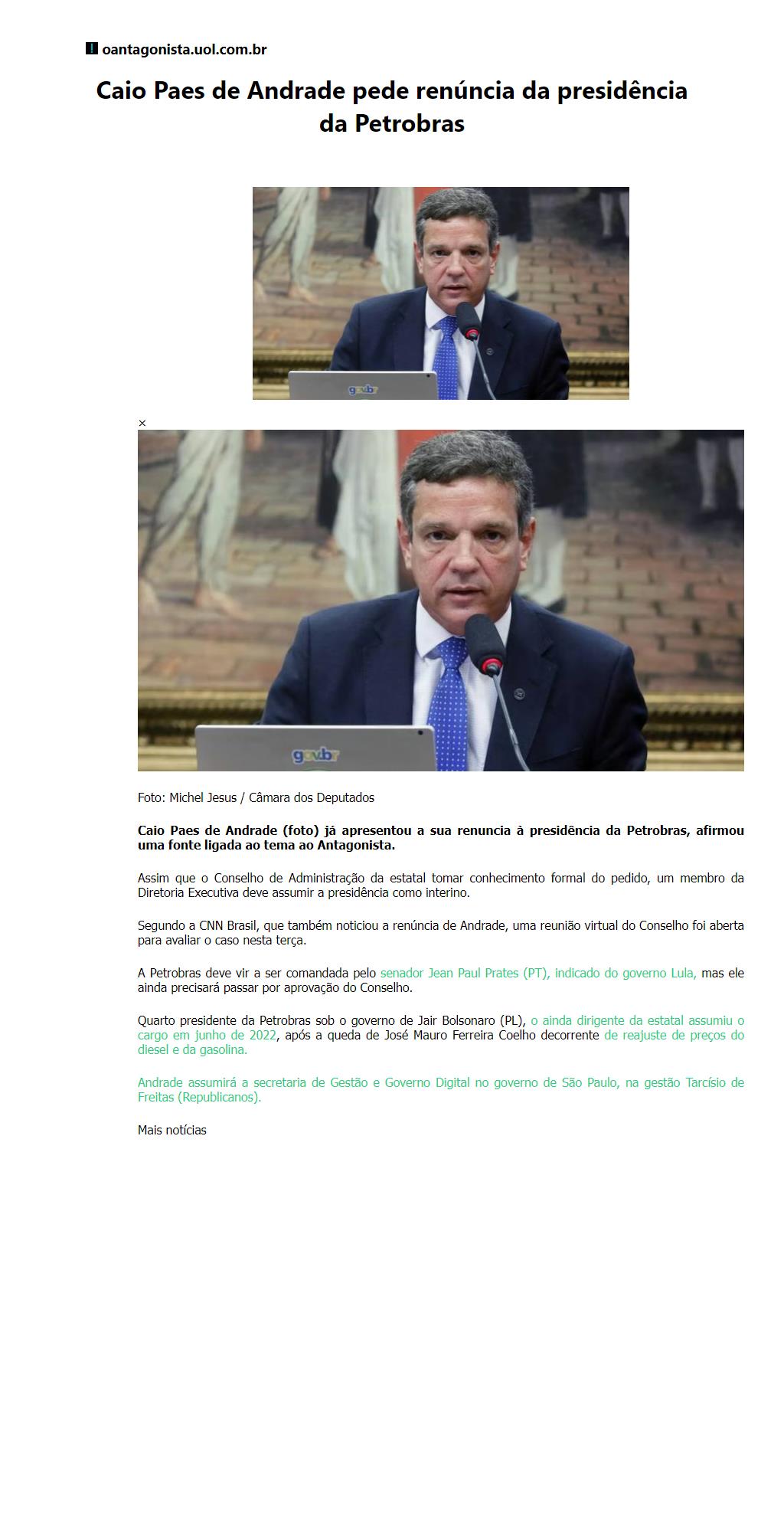 Caio Paes de Andrade pede renúncia da presidência da Petrobras