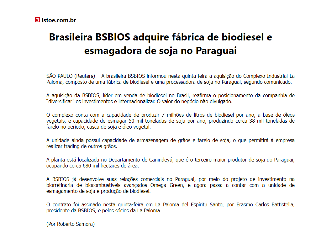 Brasileira BSBIOS adquire fábrica de biodiesel e esmagadora de soja no Paraguai
