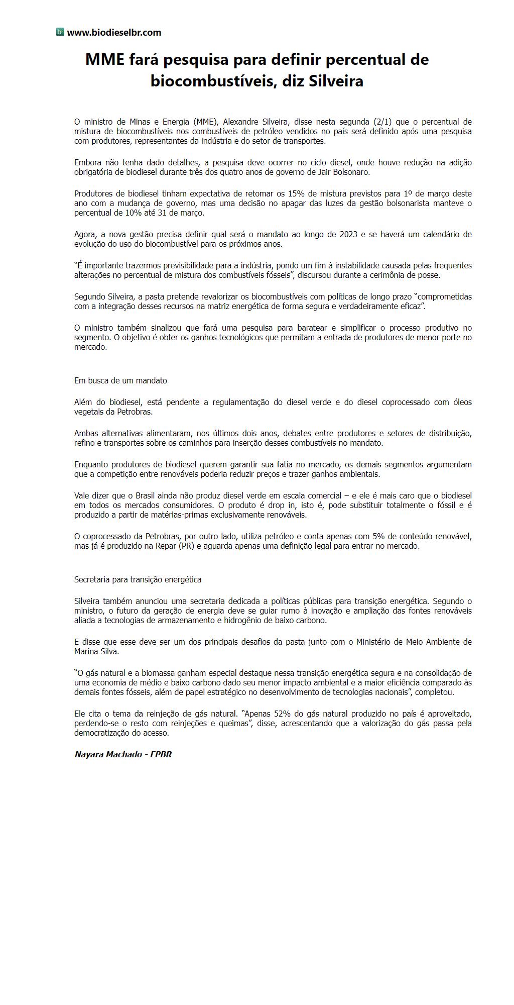 MME fará pesquisa para definir percentual de biocombustíveis, diz Silveira