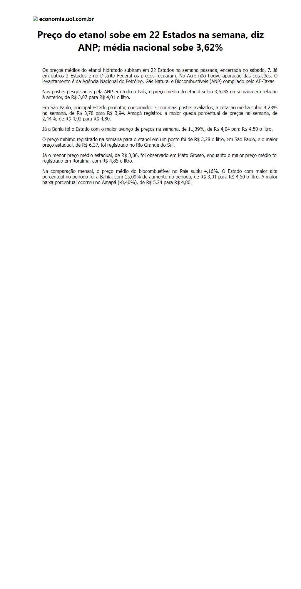 Preço do etanol sobe em 22 Estados na semana, diz ANP; média nacional sobe 3,62%