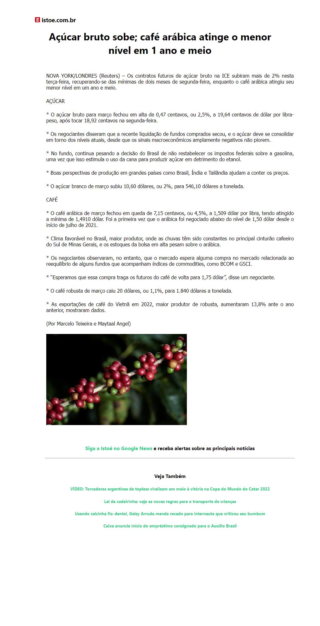 Açúcar bruto sobe; café arábica atinge o menor nível em 1 ano e meio