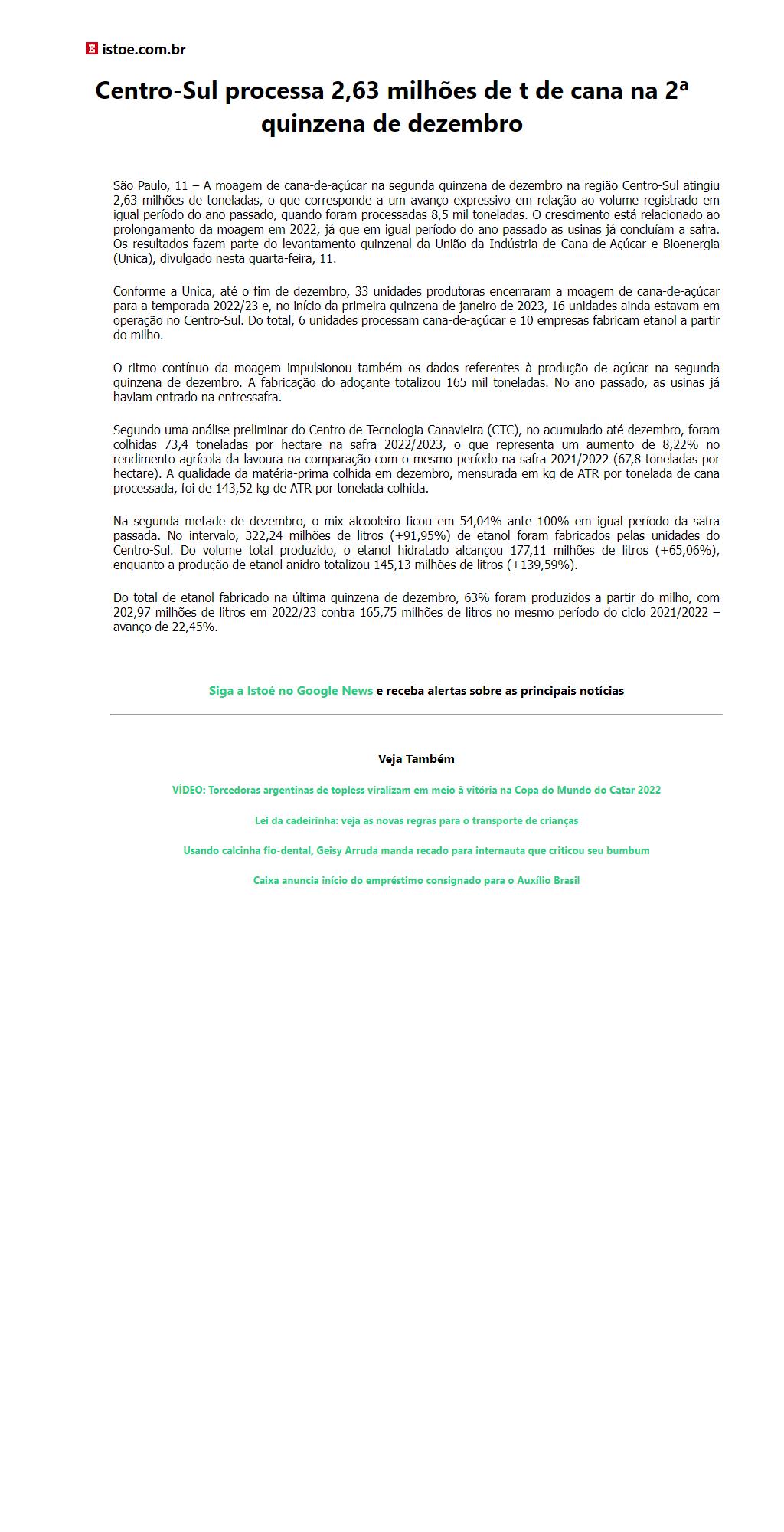 Centro-Sul processa 2,63 milhões de t de cana na 2ª quinzena de dezembro