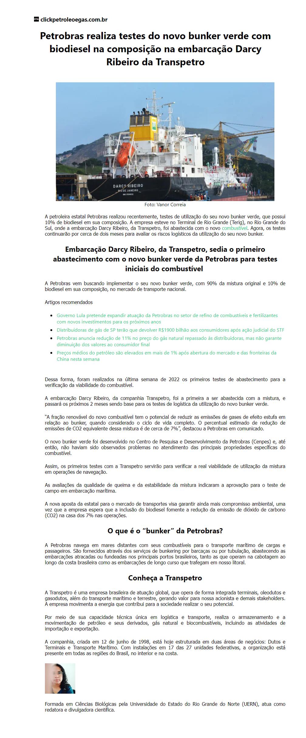 Petrobras realiza testes do novo bunker verde com biodiesel na composição na embarcação Darcy Ribeiro da Transpetro