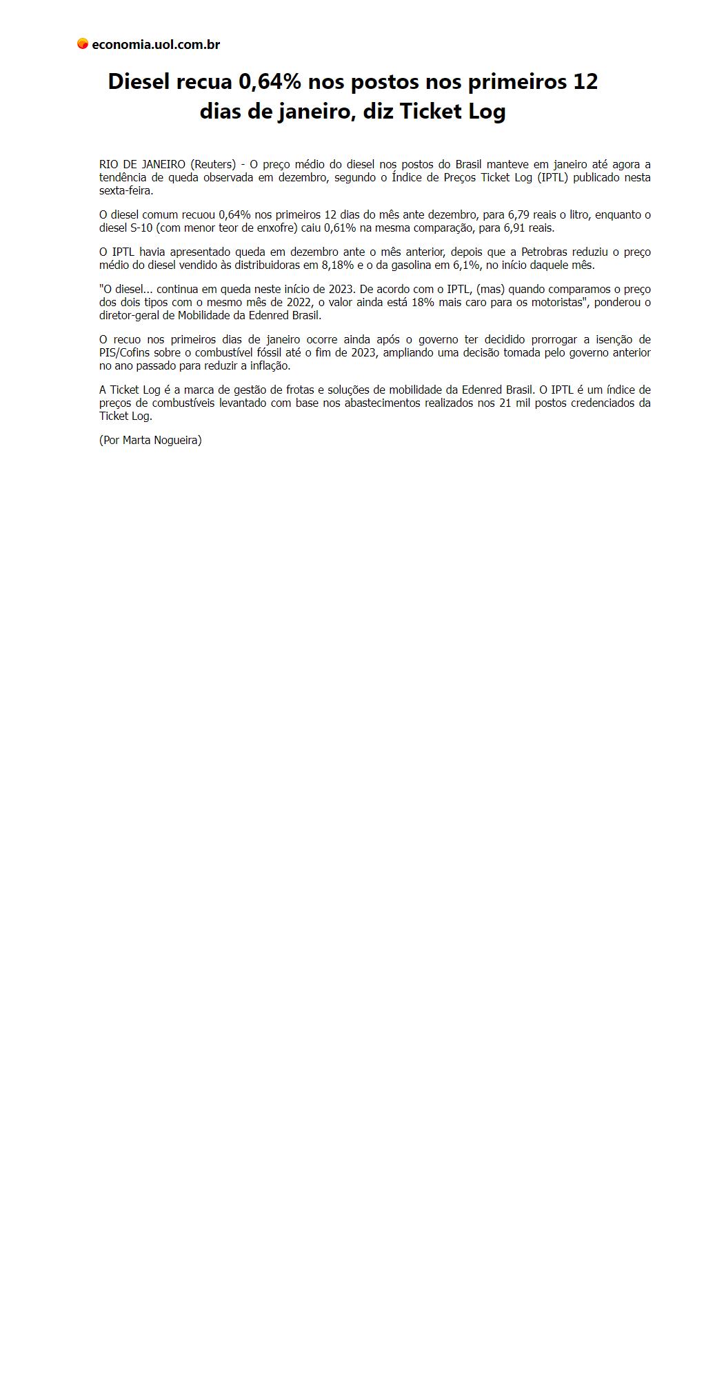 Diesel recua 0,64% nos postos nos primeiros 12 dias de janeiro, diz Ticket Log