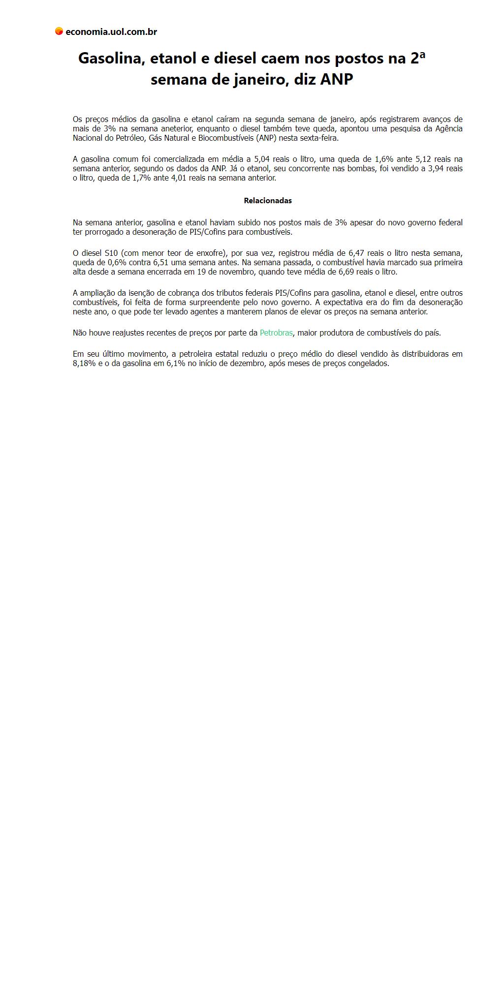 Gasolina, etanol e diesel caem nos postos na 2ª semana de janeiro, diz ANP