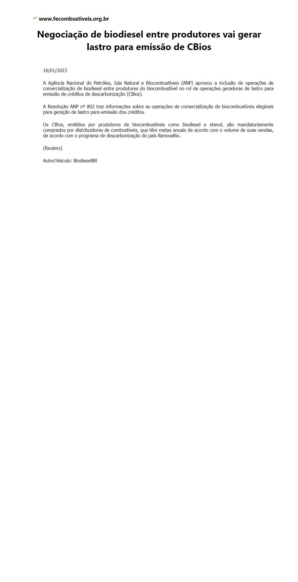 Negociação de biodiesel entre produtores vai gerar lastro para emissão de CBios