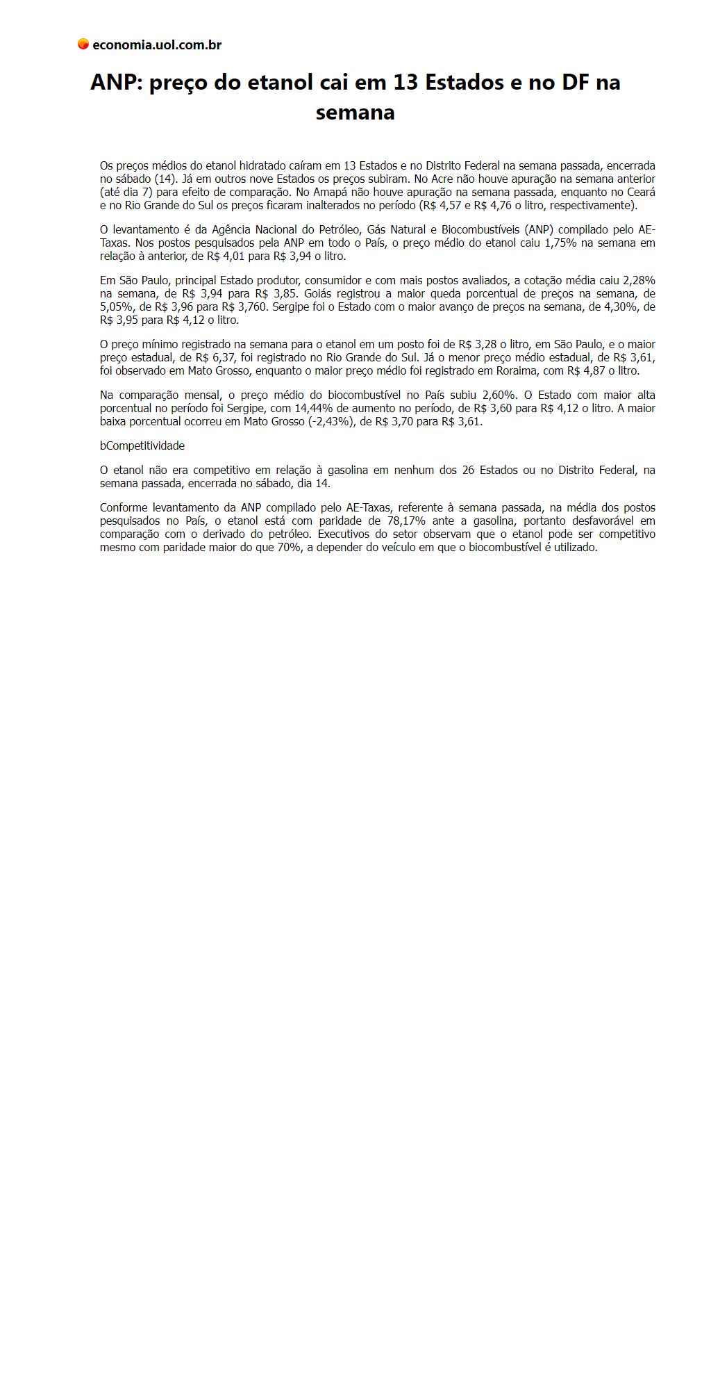 ANP: preço do etanol cai em 13 Estados e no DF na semana