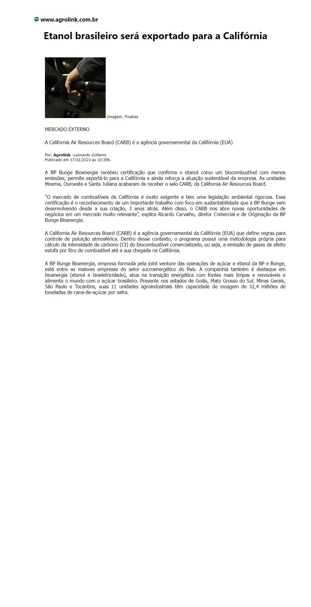 Etanol brasileiro será exportado para a Califórnia