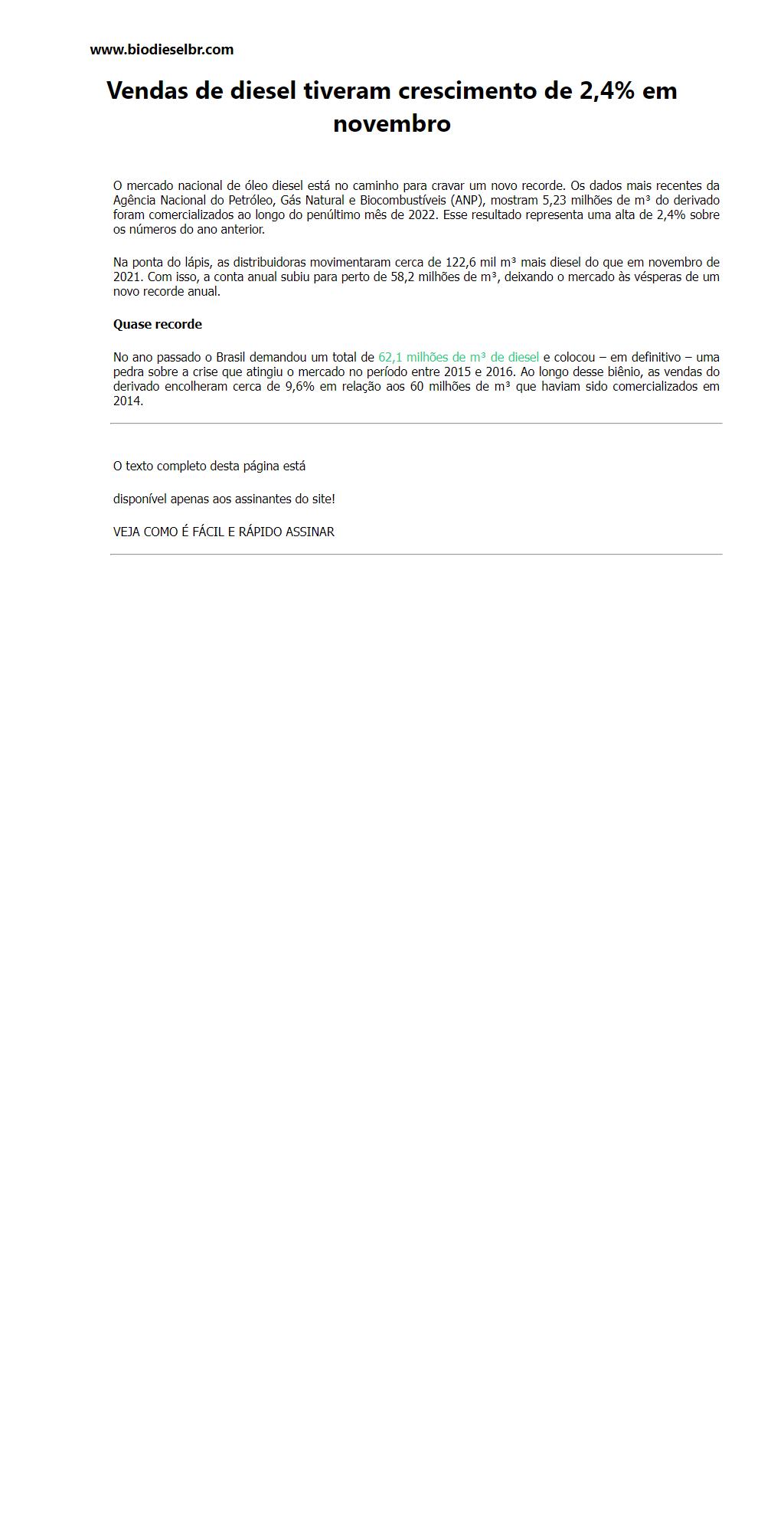 Vendas de diesel tiveram crescimento de 2,4% em novembro