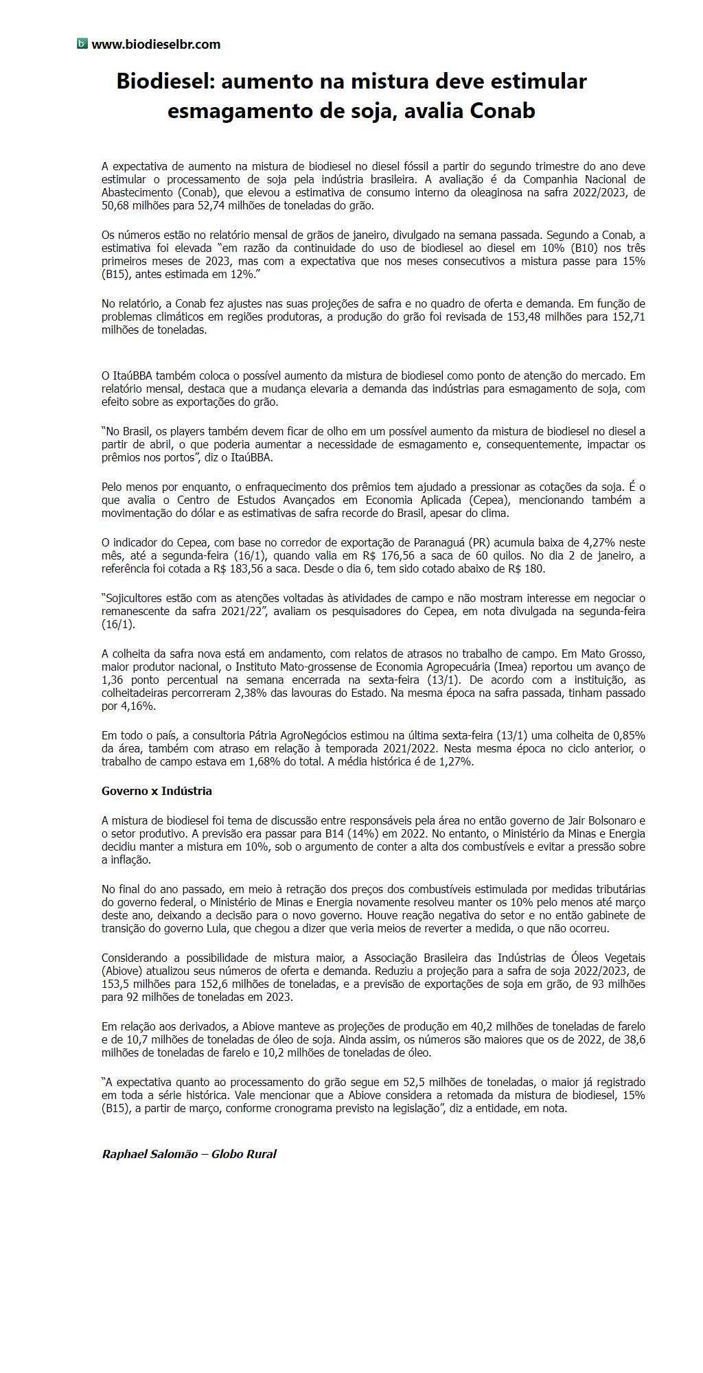 Biodiesel: aumento na mistura deve estimular esmagamento de soja, avalia Conab