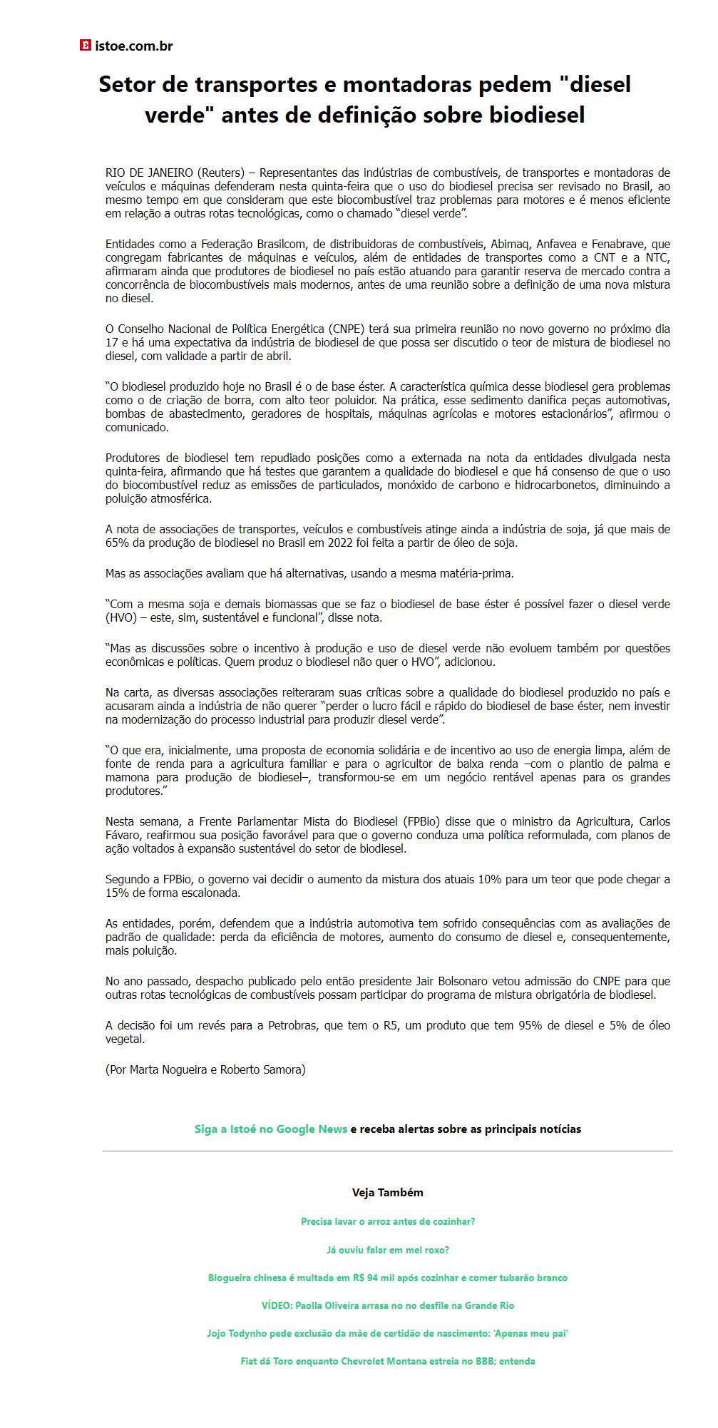 Setor de transportes e montadoras pedem "diesel verde" antes de definição sobre biodiesel