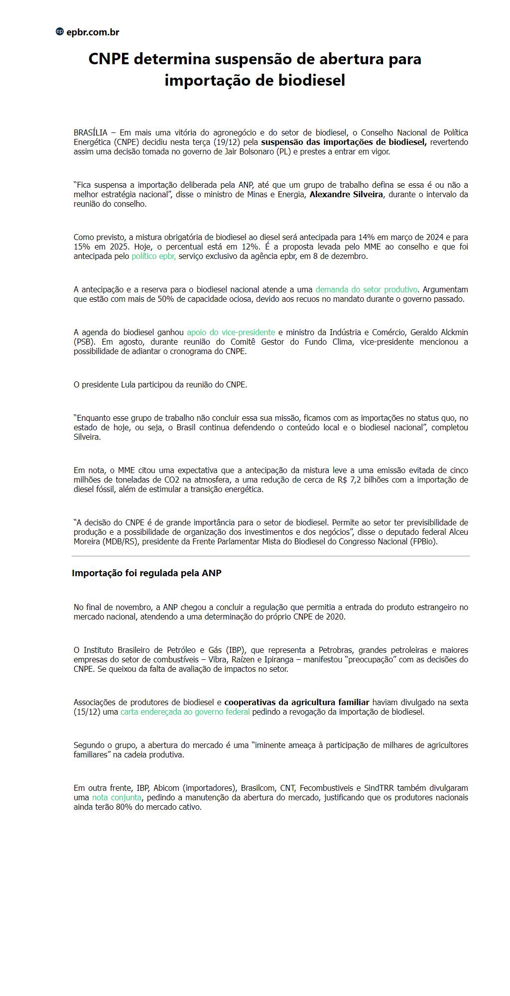 CNPE determina suspensão de abertura para importação de biodiesel