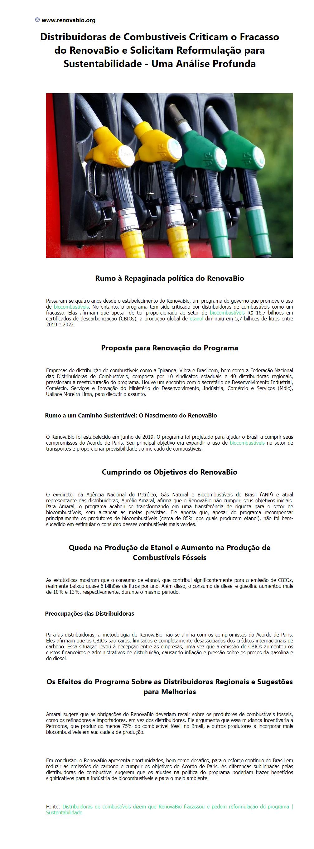 Distribuidoras de Combustíveis Criticam o Fracasso do RenovaBio e Solicitam Reformulação para Sustentabilidade - Uma Aná