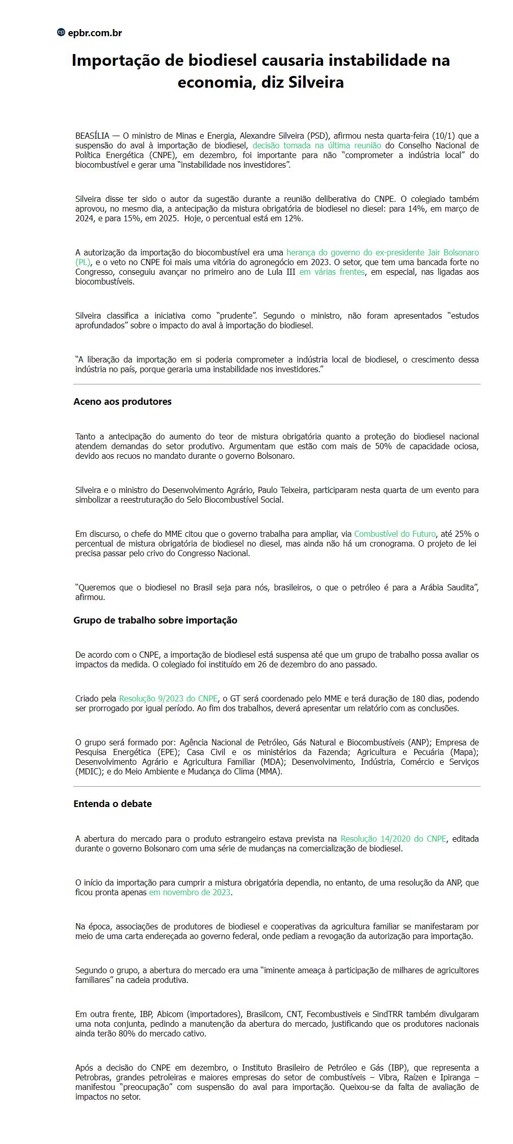 Importação de biodiesel causaria instabilidade na economia, diz Silveira