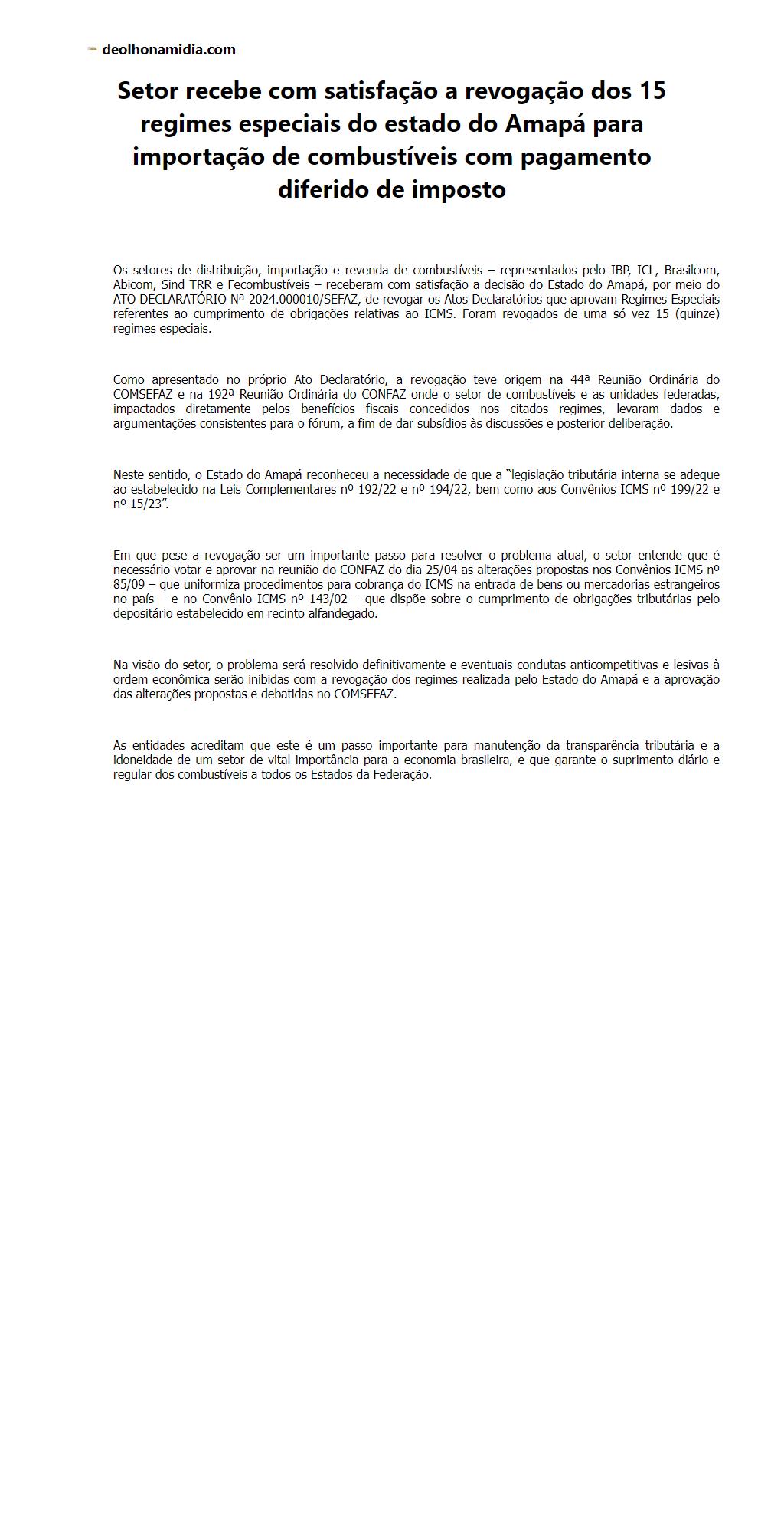 Setor recebe com satisfação a revogação dos 15 regimes especiais do estado do Amapá para importação de combustíveis com