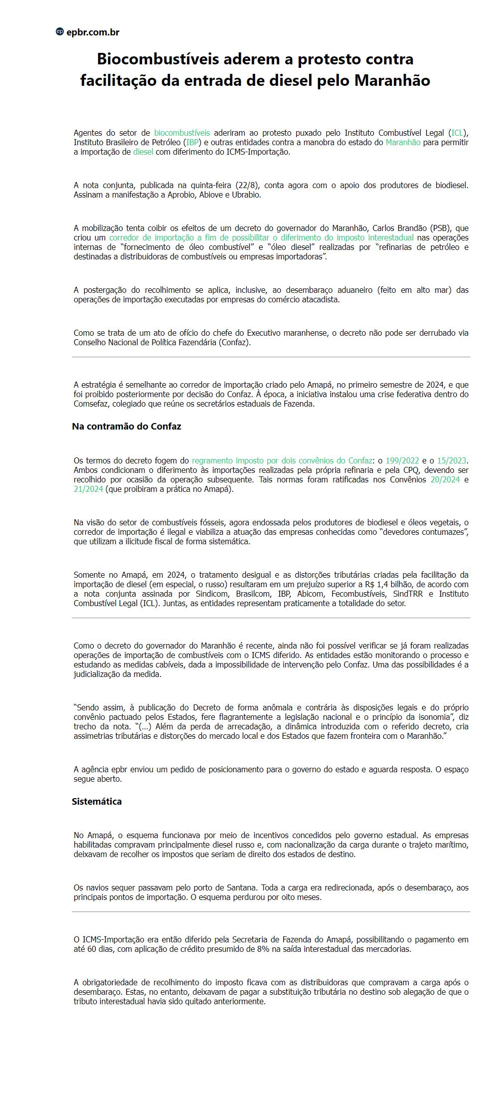 Biocombustíveis aderem a protesto contra facilitação da entrada de diesel pelo Maranhão