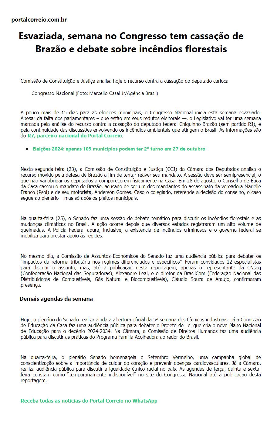 Esvaziada, semana no Congresso tem cassação de Brazão e debate sobre incêndios florestais