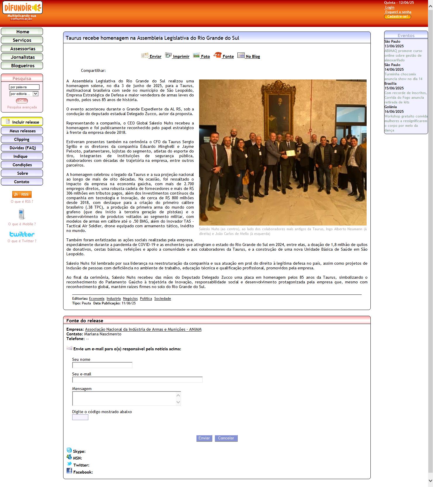 Release: Taurus recebe homenagem na Assembleia Legislativa do Rio Grande do Sul
