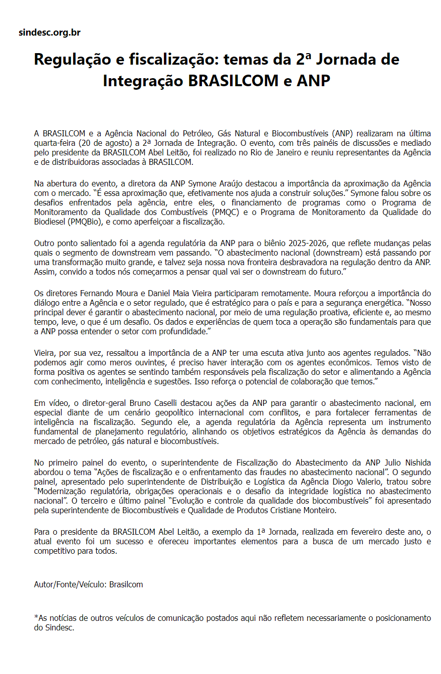 Regulação e fiscalização: temas da 2ª Jornada de Integração BRASILCOM e ANP