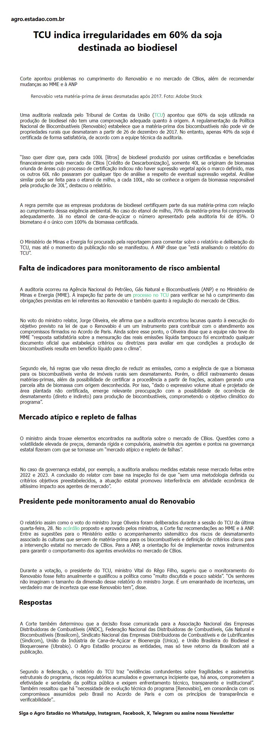 TCU indica irregularidades em 60% da soja destinada ao biodiesel