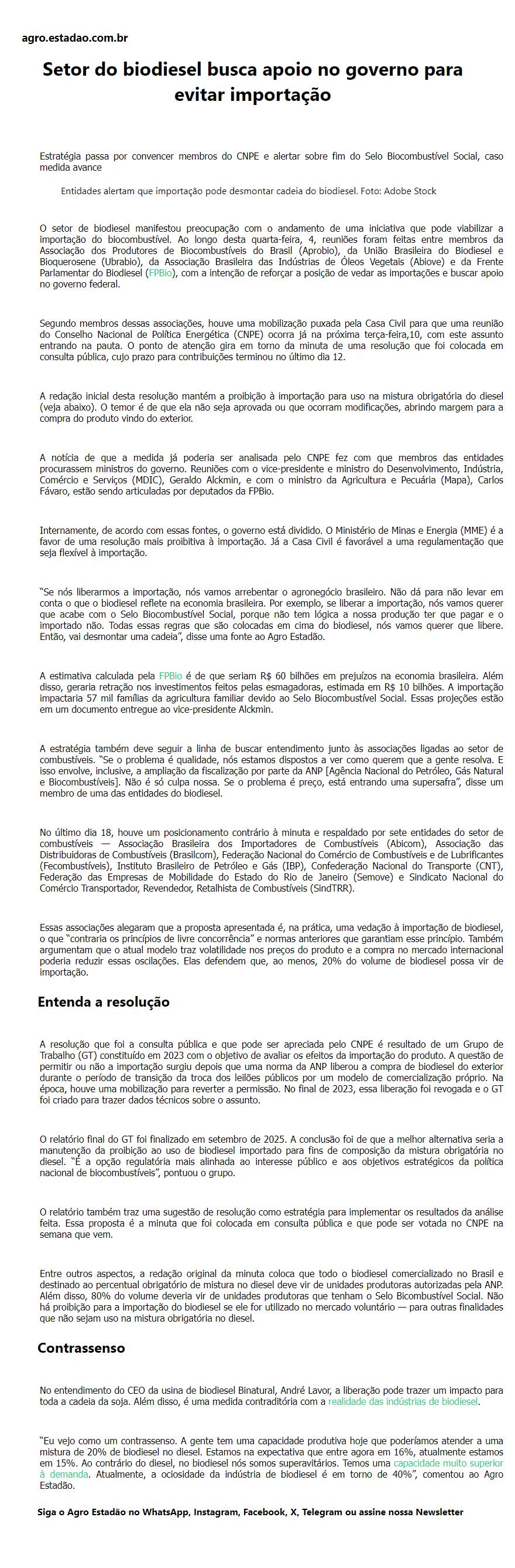 Setor do biodiesel busca apoio no governo para evitar importação