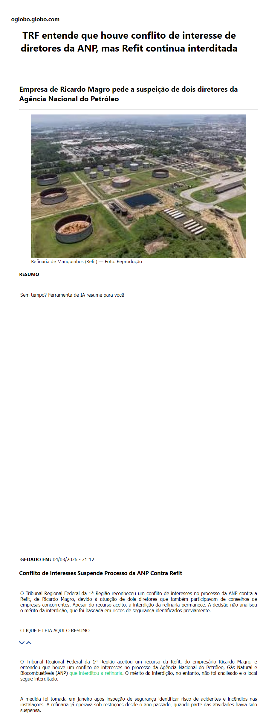 TRF entende que houve conflito de interesse de diretores da ANP, mas Refit continua interditada