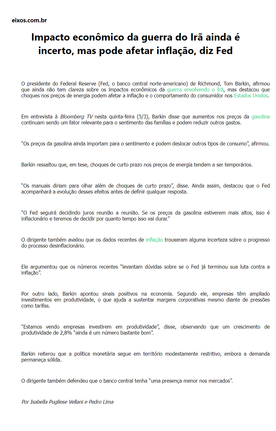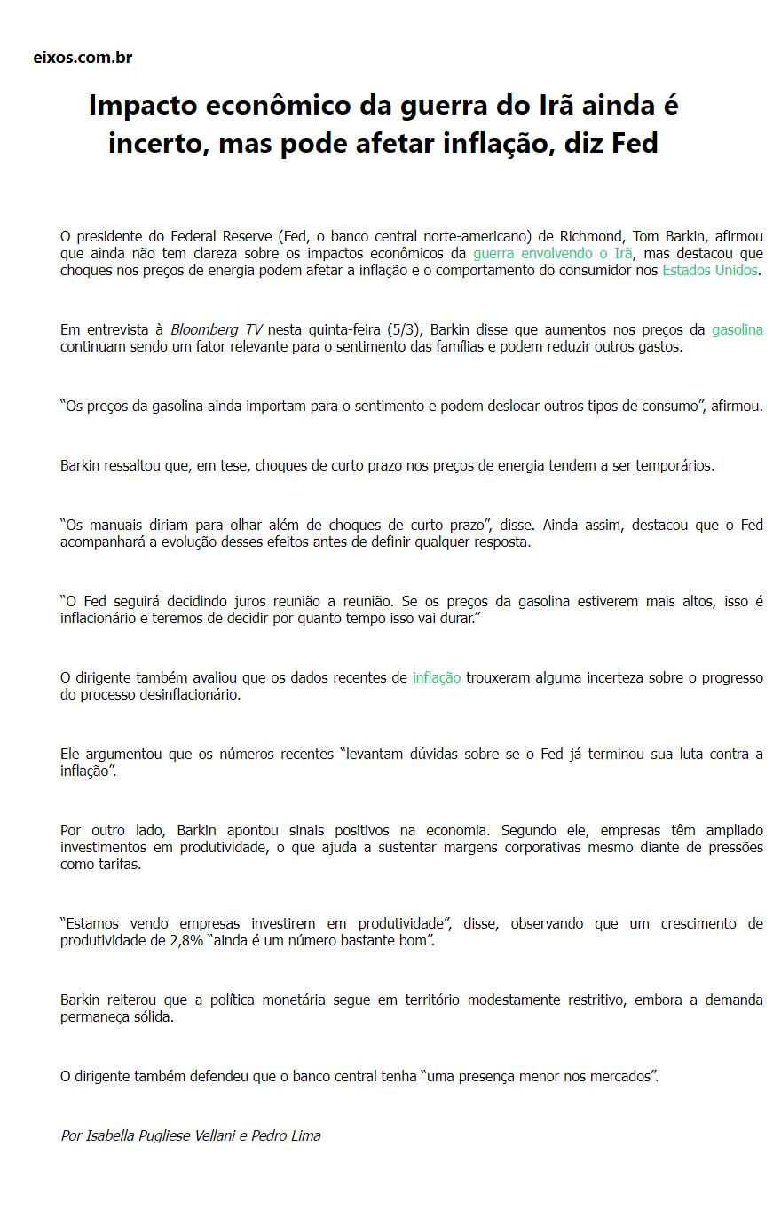 Impacto econômico da guerra do Irã ainda é incerto, mas pode afetar inflação, diz Fed