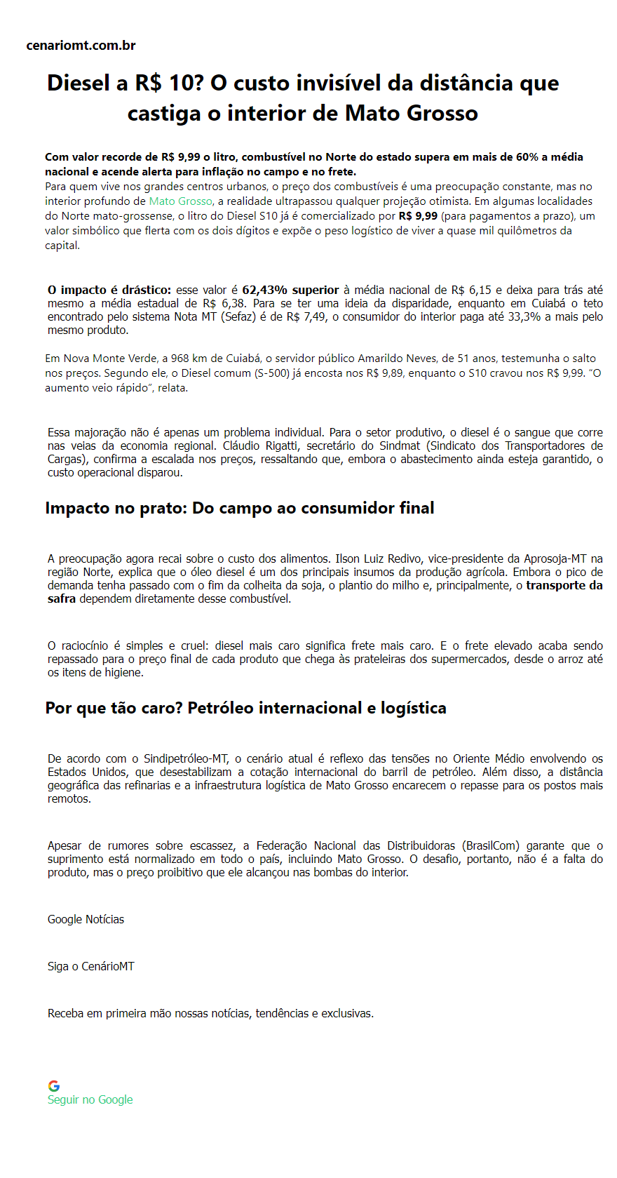 Diesel a R$ 10? O custo invisível da distância que castiga o interior de Mato Grosso