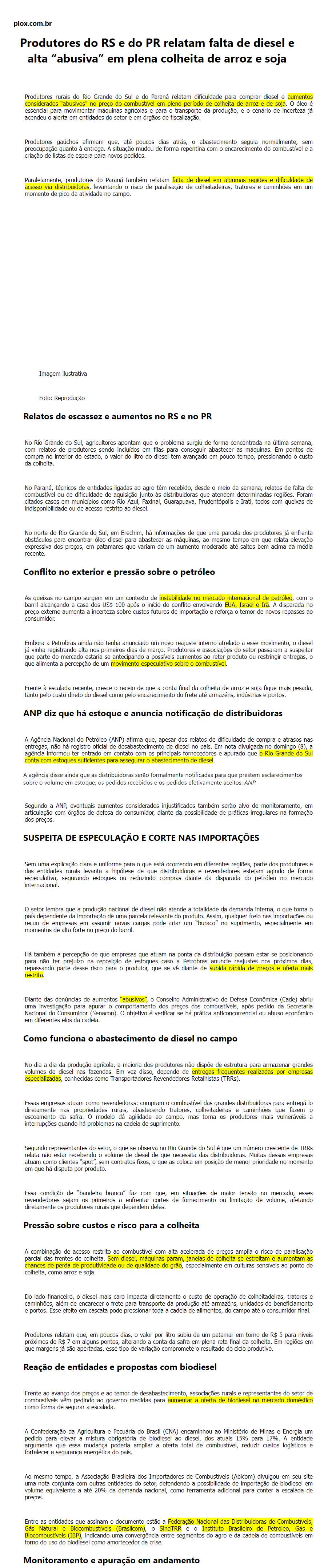 Produtores do RS e do PR relatam falta de diesel e alta abusiva em plena colheita de arroz e soja