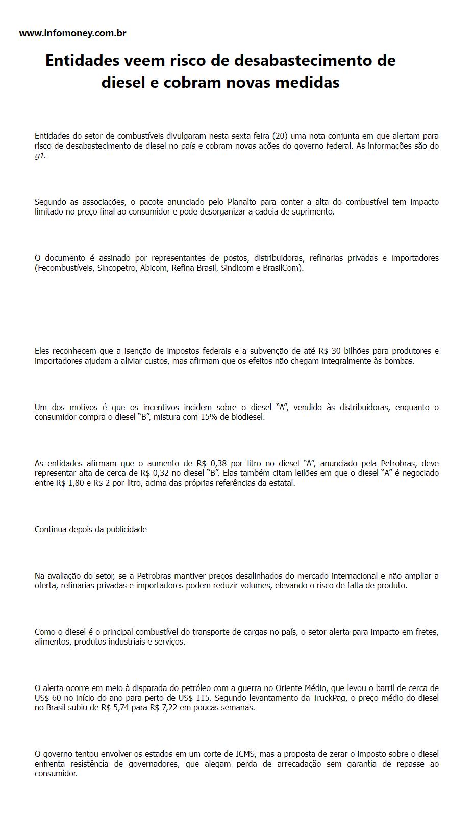Entidades veem risco de desabastecimento de diesel e cobram novas medidas