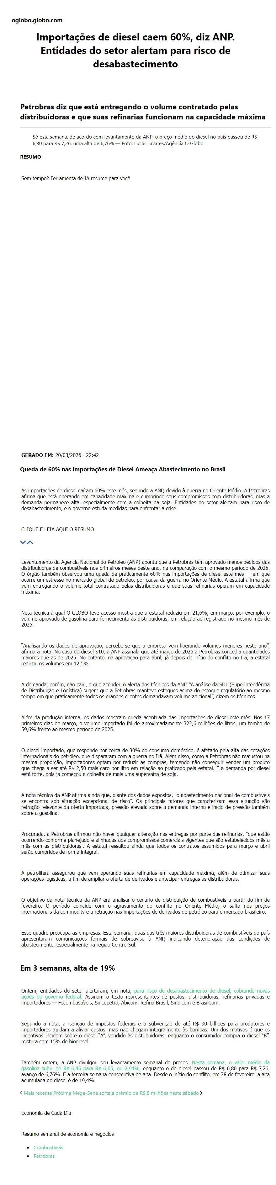 Importações de diesel caem 60%, diz ANP. Entidades do setor alertam para risco de desabastecimento