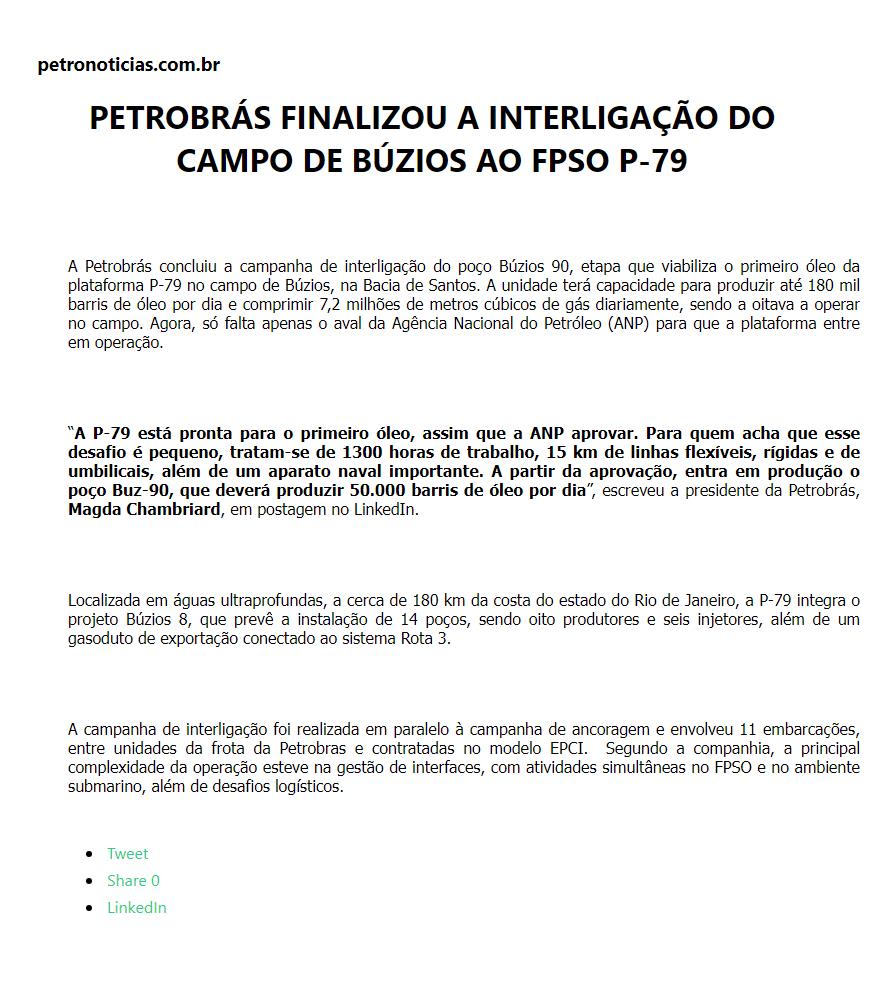 PETROBRÁS FINALIZOU A INTERLIGAÇÃO DO CAMPO DE BÚZIOS AO FPSO P-79