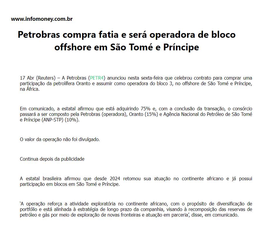 Petrobras compra fatia e será operadora de bloco offshore em São Tomé e Príncipe