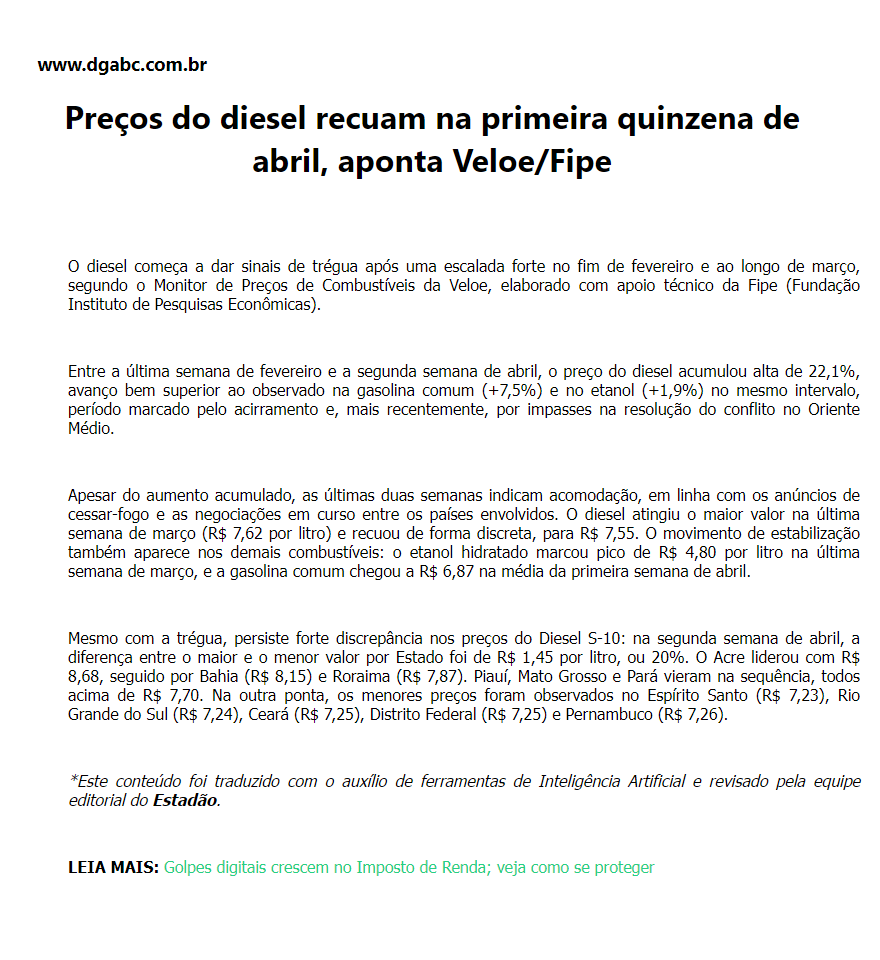 Preços do diesel recuam na primeira quinzena de abril, aponta Veloe/Fipe