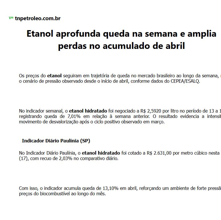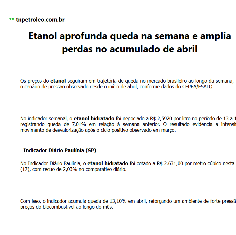 Etanol aprofunda queda na semana e amplia perdas no acumulado de abril