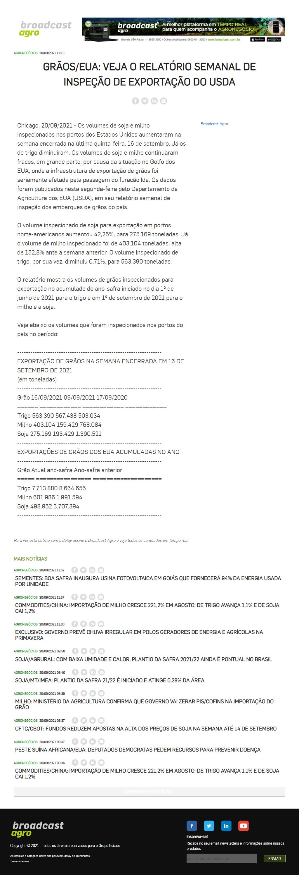 Grãos/EUA: Veja o relatório semanal de inspeção de exportação do USDA