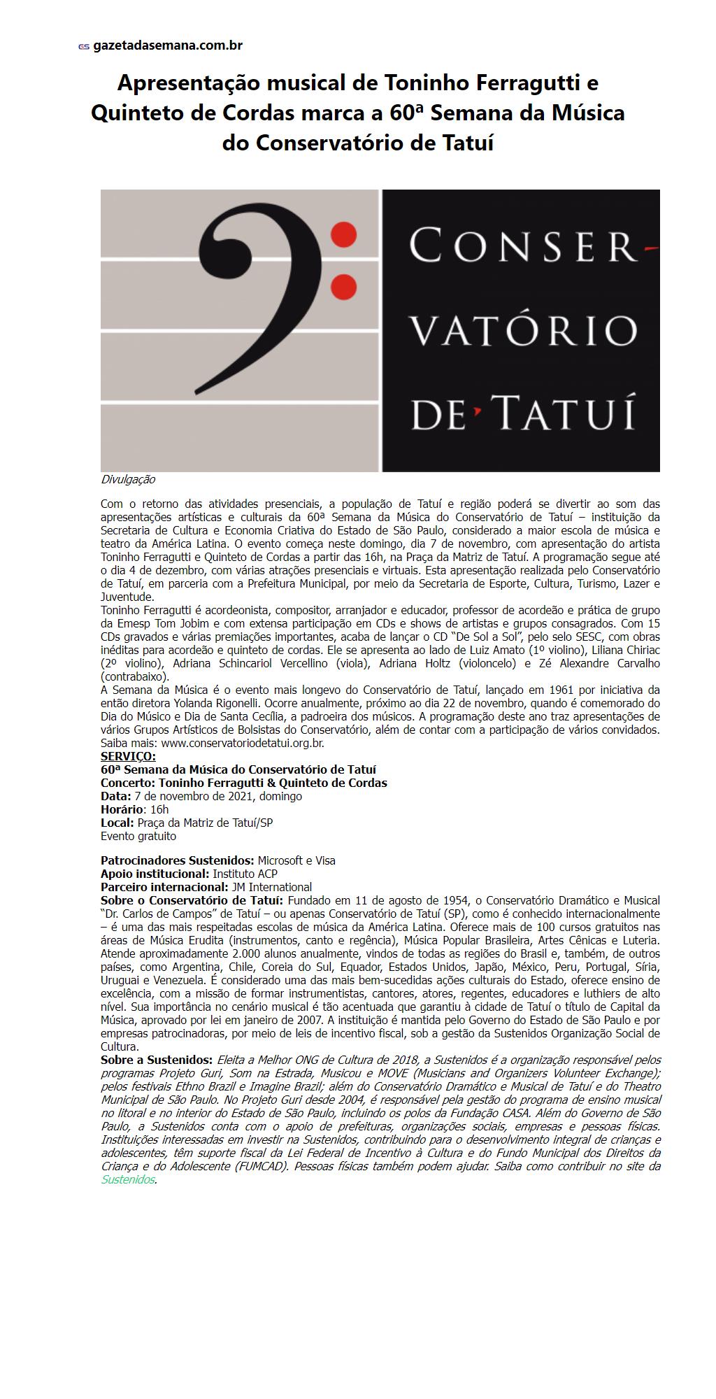 Apresentação musical de Toninho Ferragutti e Quinteto de Cordas marca a 60ª Semana da Música do Conservatório de Tatuí
