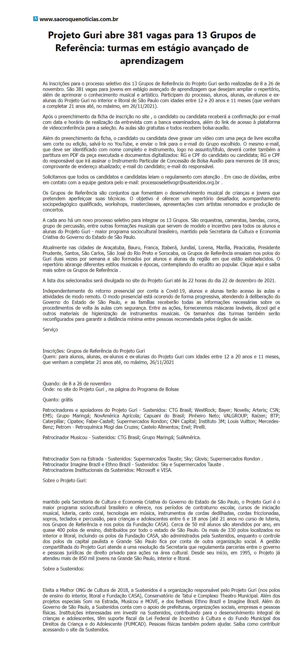 Projeto Guri abre 381 vagas para 13 Grupos de Referência: turmas em estágio avançado de aprendizagem