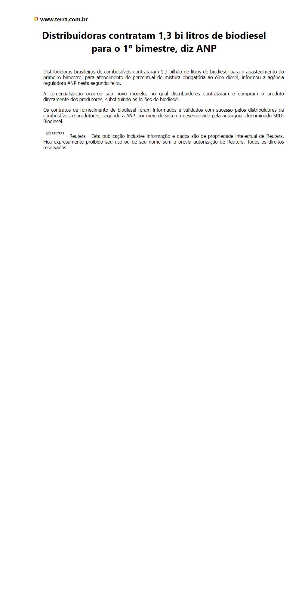 Distribuidoras contratam 1,3 bi litros de biodiesel para o 1º bimestre, diz ANP