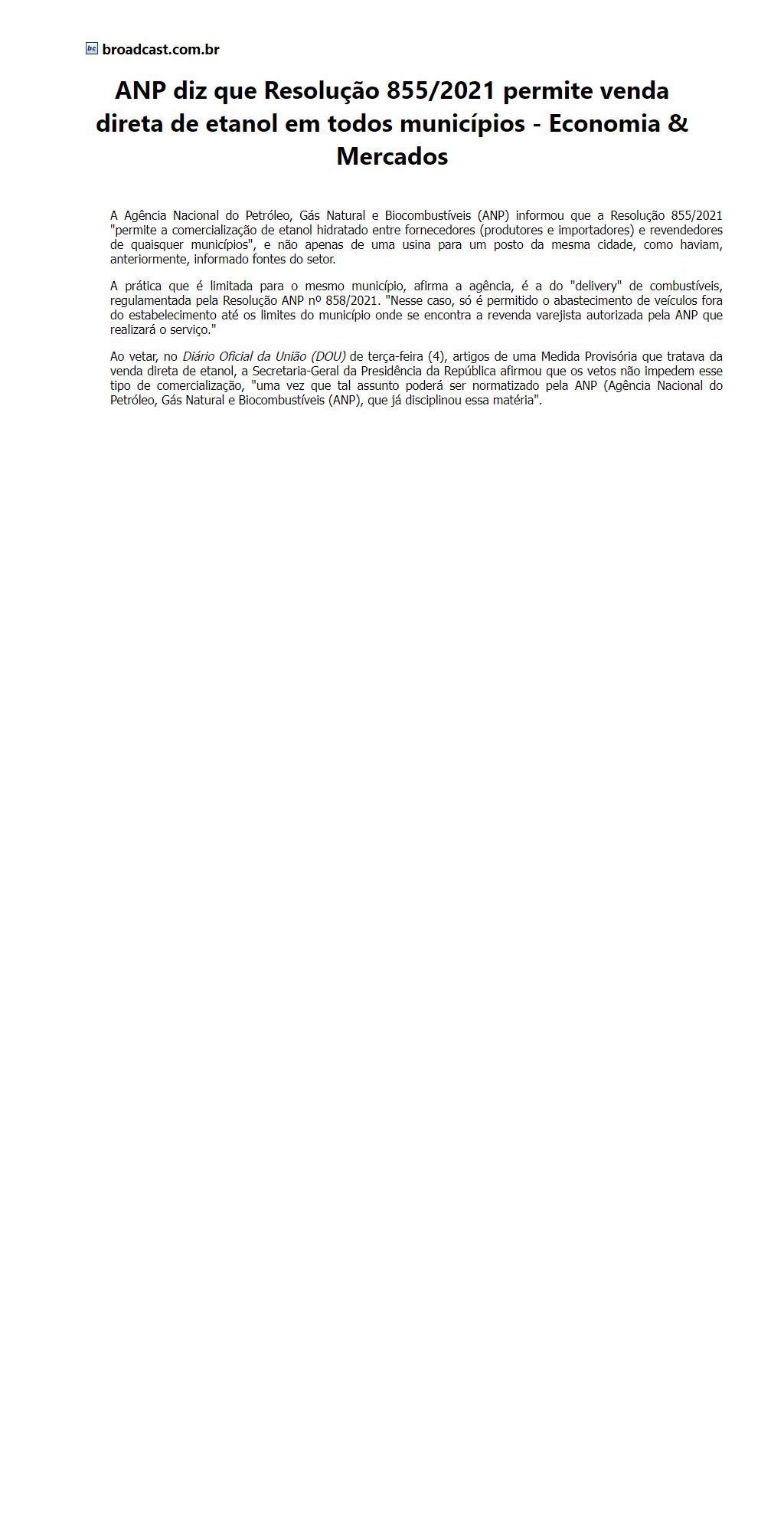ANP diz que Resolução 855/2021 permite venda direta de etanol em todos municípios