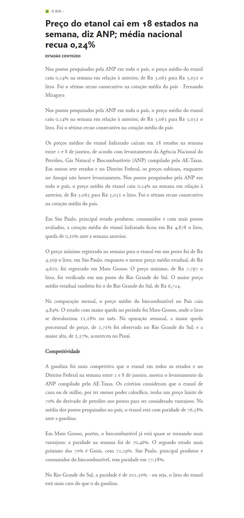 Preço do etanol cai em 18 estados na semana, diz ANP; média nacional recua 0,24%