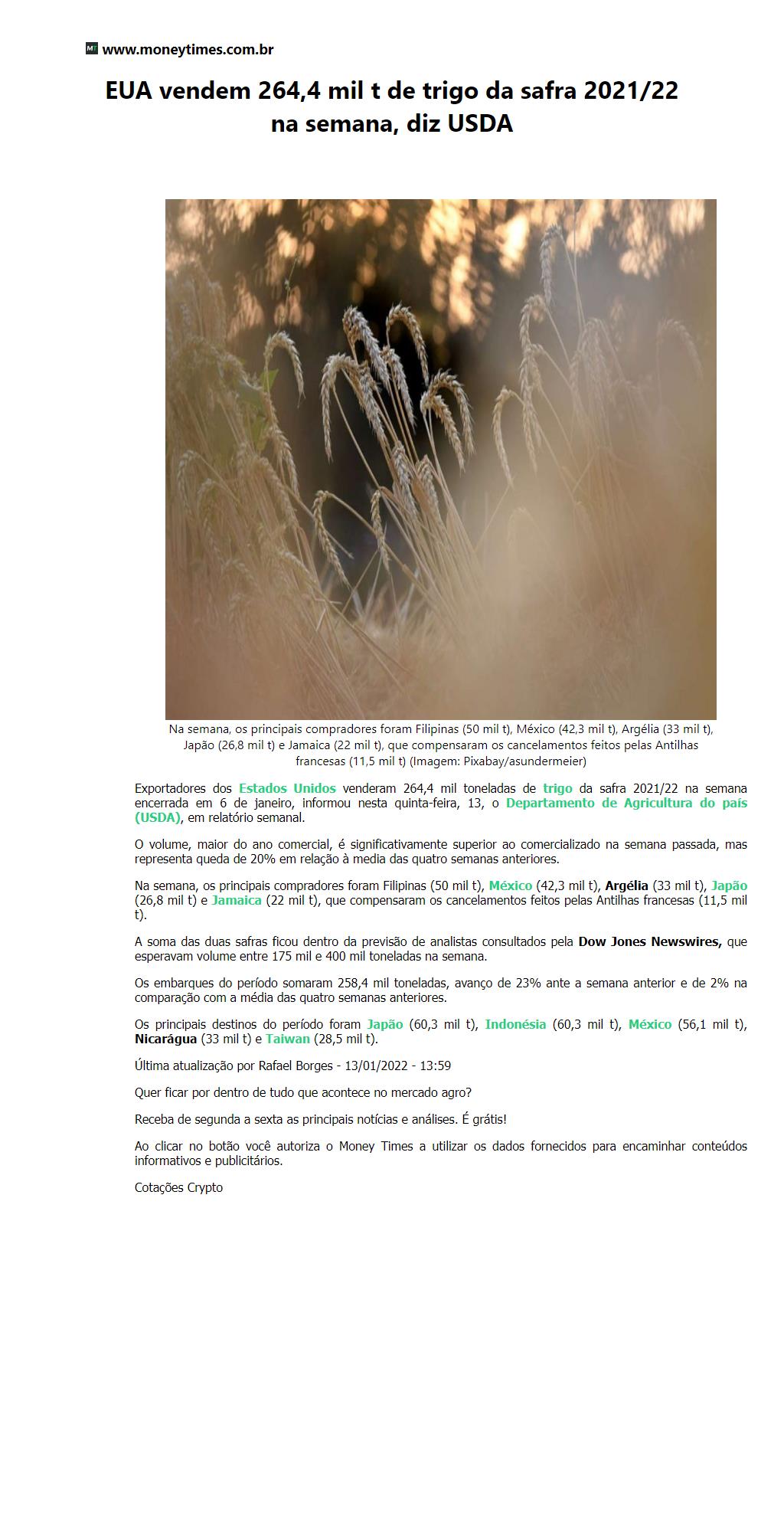 EUA vendem 264,4 mil t de trigo da safra 2021/22 na semana, diz USDA