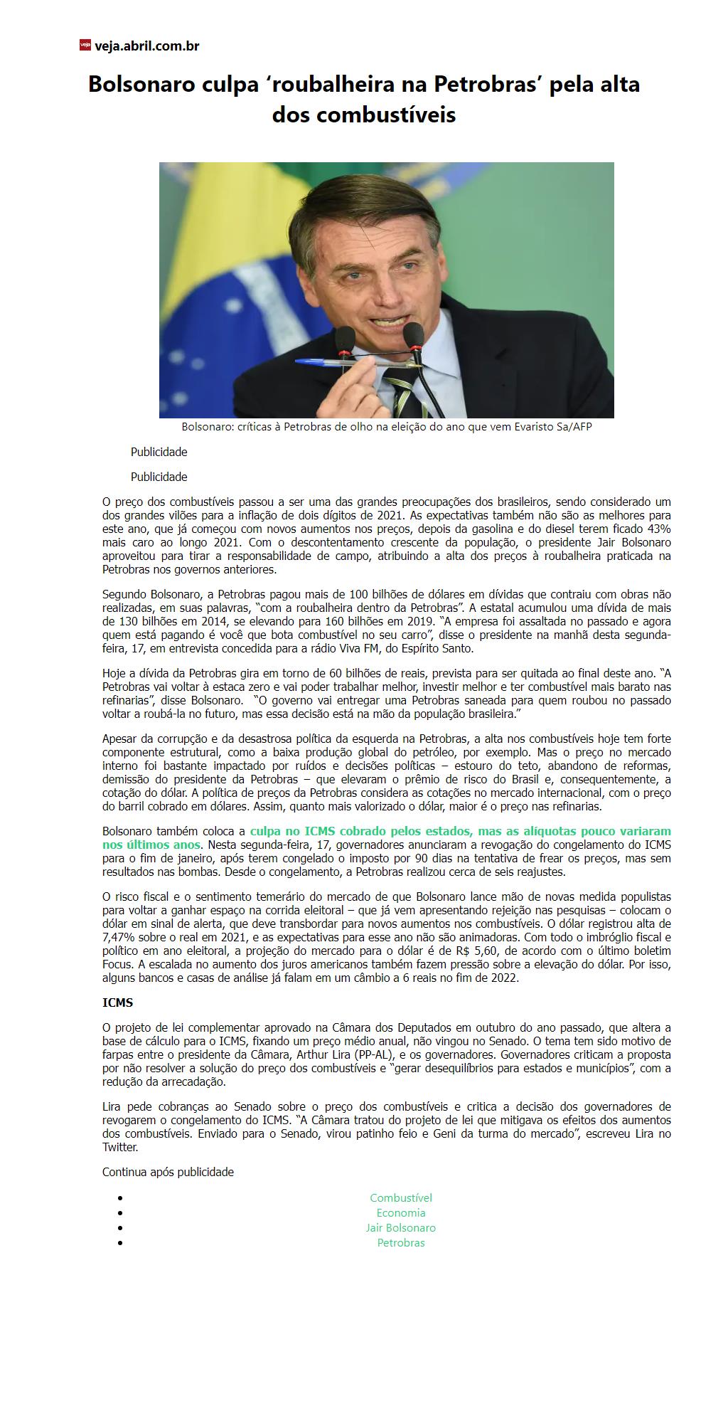Bolsonaro culpa roubalheira na Petrobras pela alta dos combustíveis