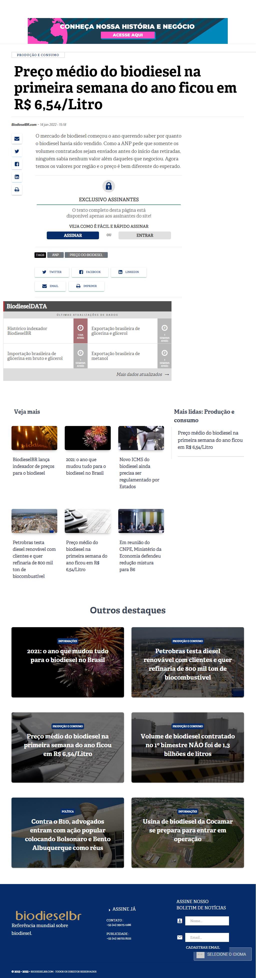 Preço médio do biodiesel na primeira semana do ano ficou em R$ 6,54/Litro