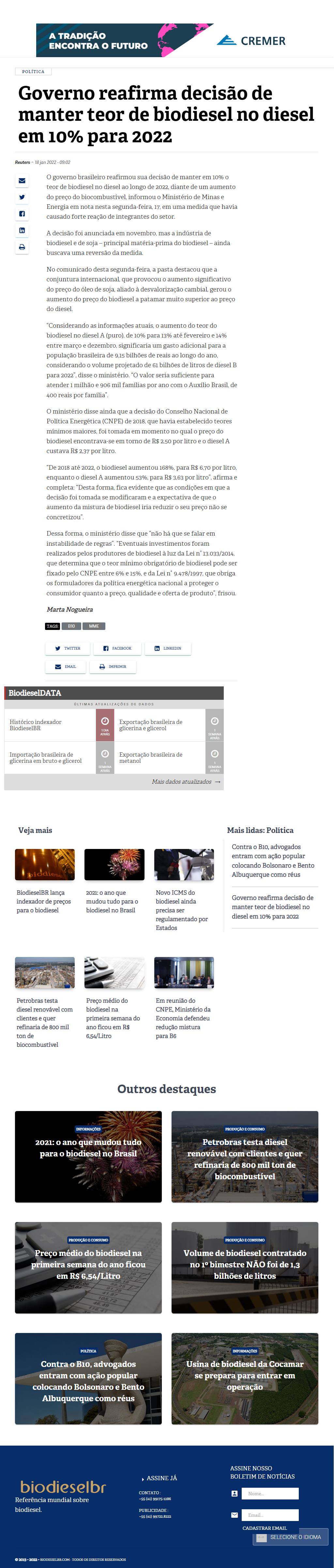 Governo reafirma decisão de manter teor de biodiesel no diesel em 10% para 2022