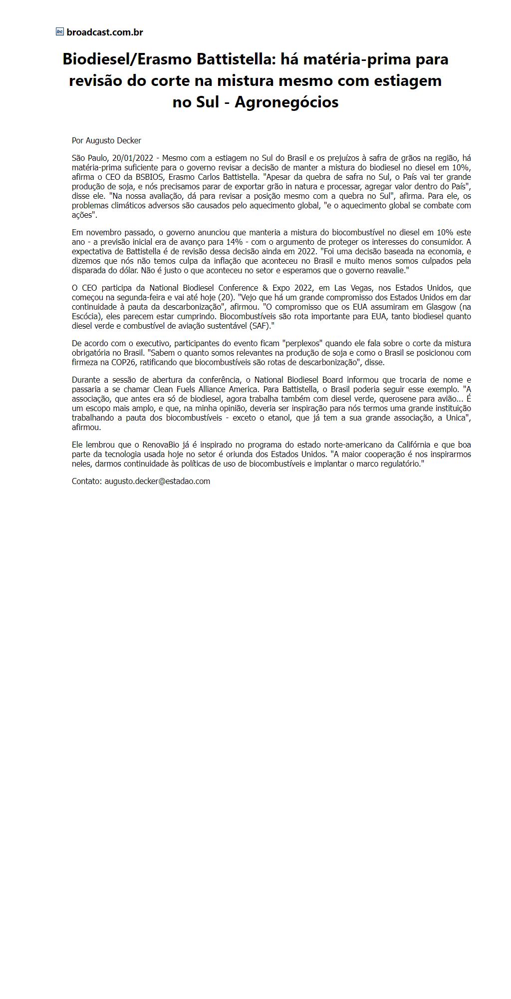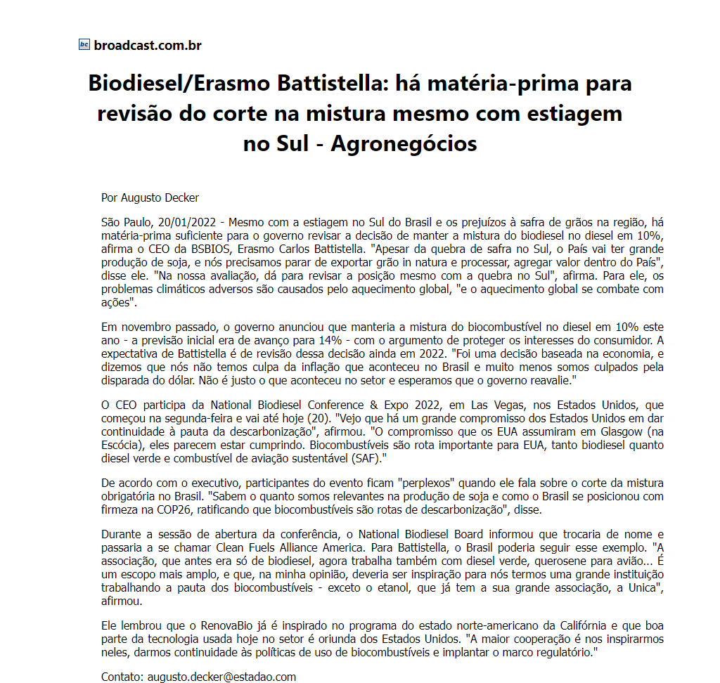 Biodiesel/Erasmo Battistella: há matéria-prima para revisão do corte na mistura mesmo com estiagem no Sul