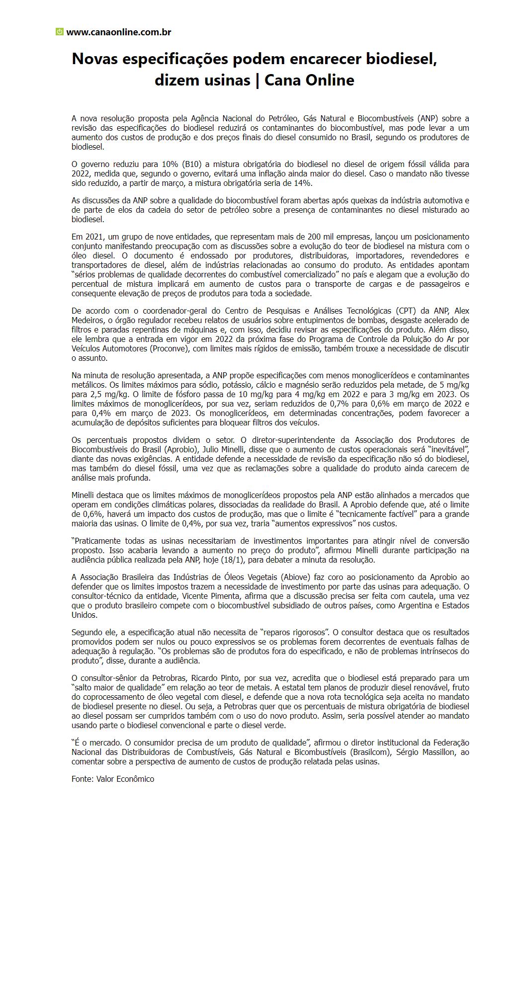 Novas especificações podem encarecer biodiesel, dizem usinas 20-01-2022