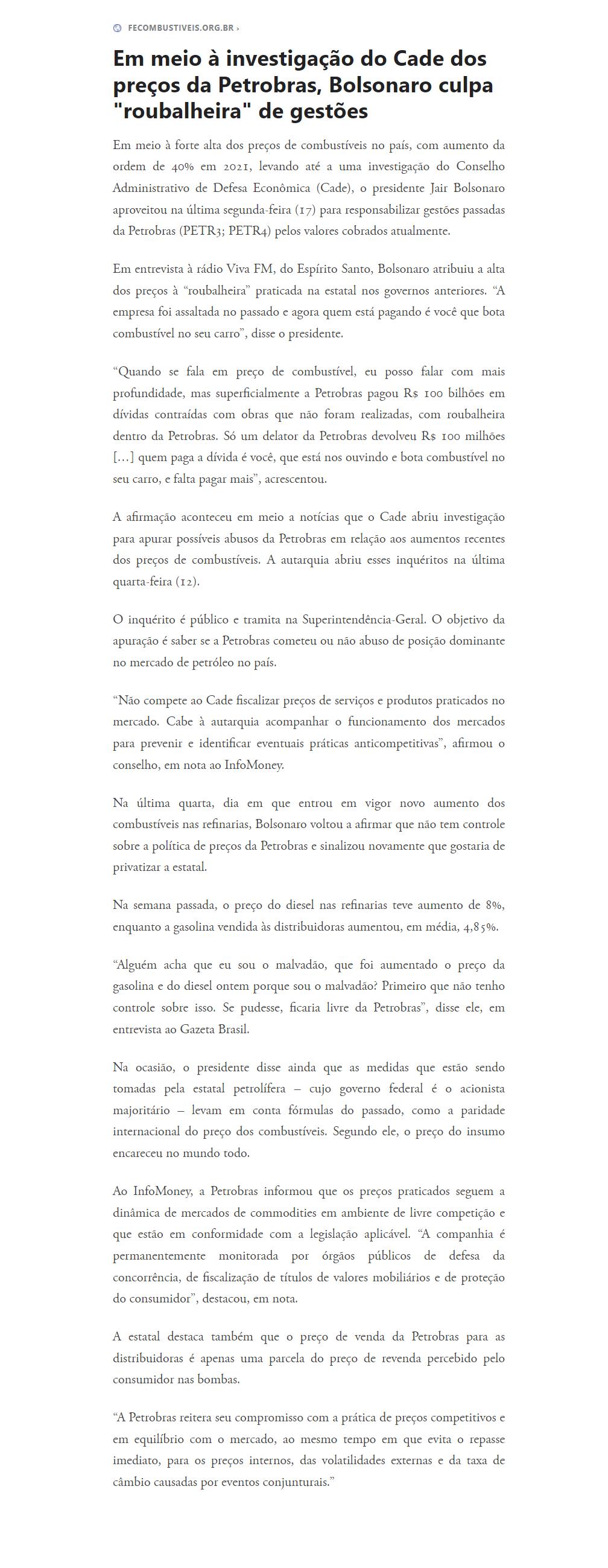Em meio à investigação do Cade dos preços da Petrobras, Bolsonaro culpa "roubalheira" de gestões