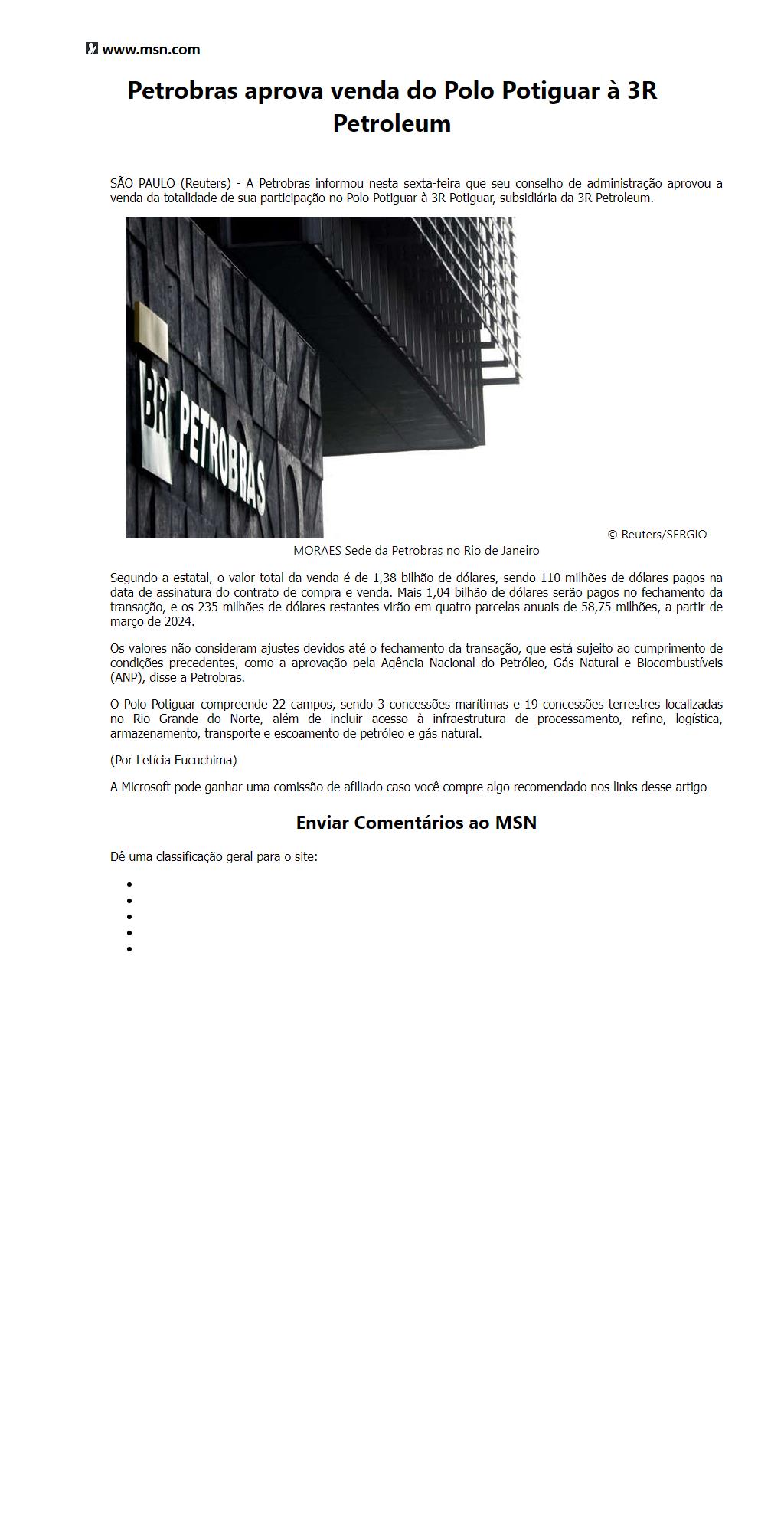 Petrobras aprova venda do Polo Potiguar à 3R Petroleum