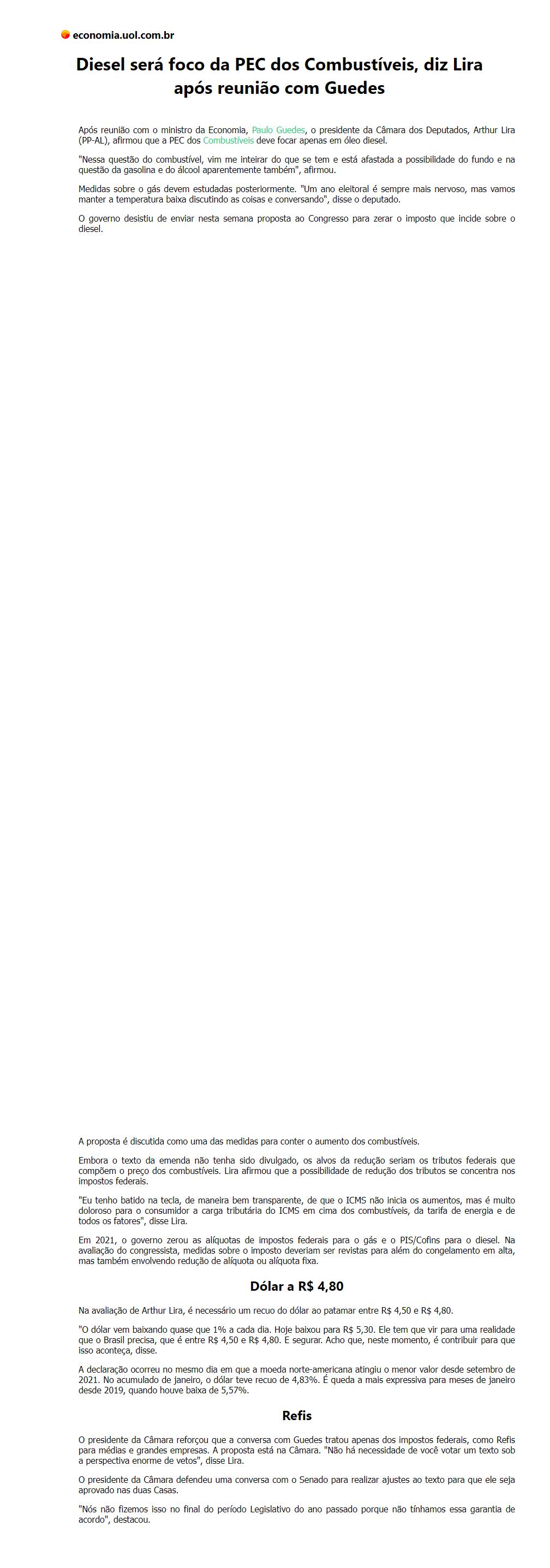 Diesel será foco da PEC dos Combustíveis, diz Lira após reunião com Guedes